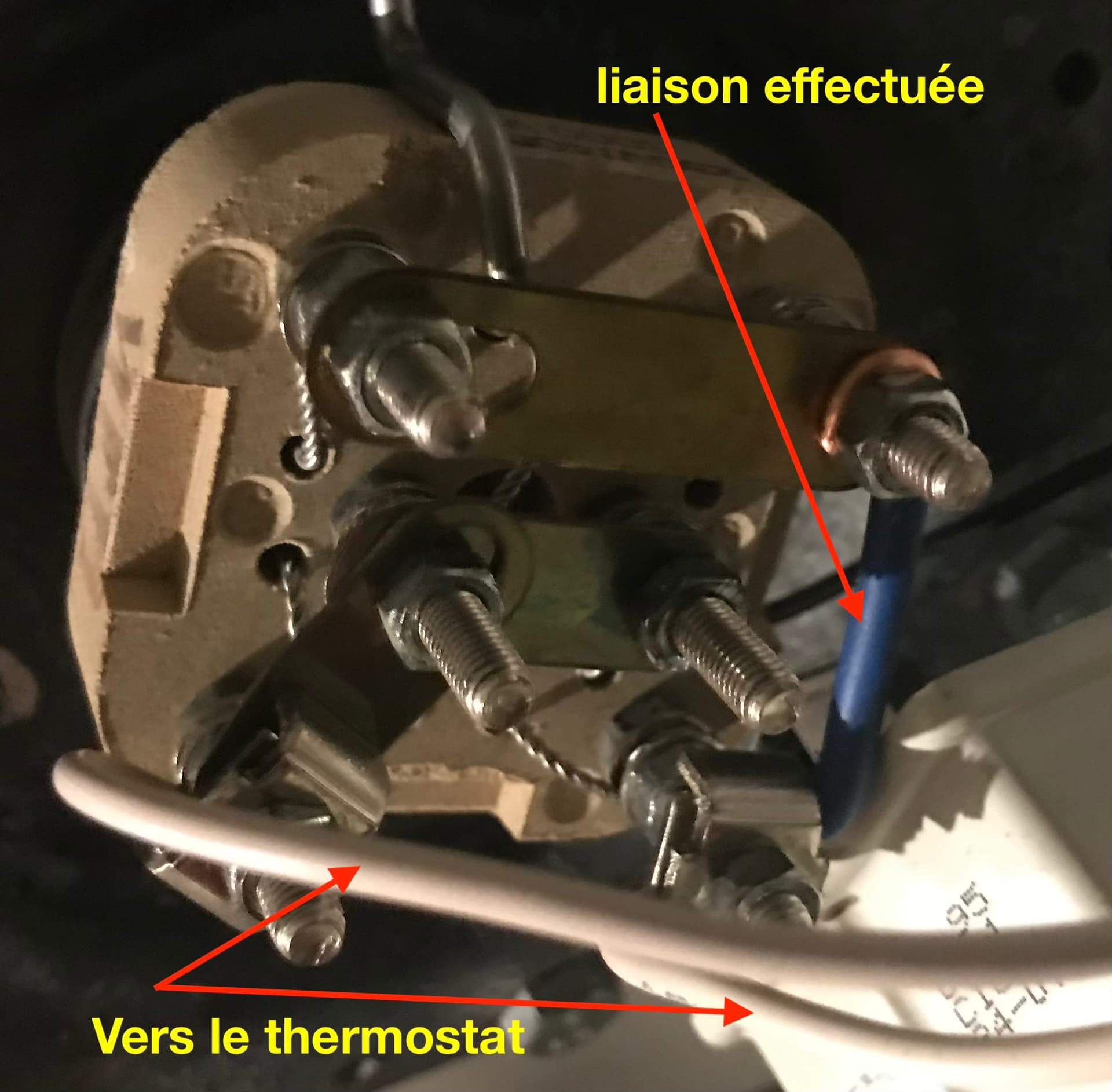 Bon je viens de voir la résistance et son branchement sur le net. Il vous faut donc relier la borne de droite à la barrette horizontale du haut avec un fil de 2.5 mm carré et le tour est joué. Sinon regardez si la barrette horizontale est double dans ce cas dévissez les bornes reliées par cette barrette pour en dégager une et la relier à la borne de droite afin de former un L à l’envers. Resserrez le tout et c fini.