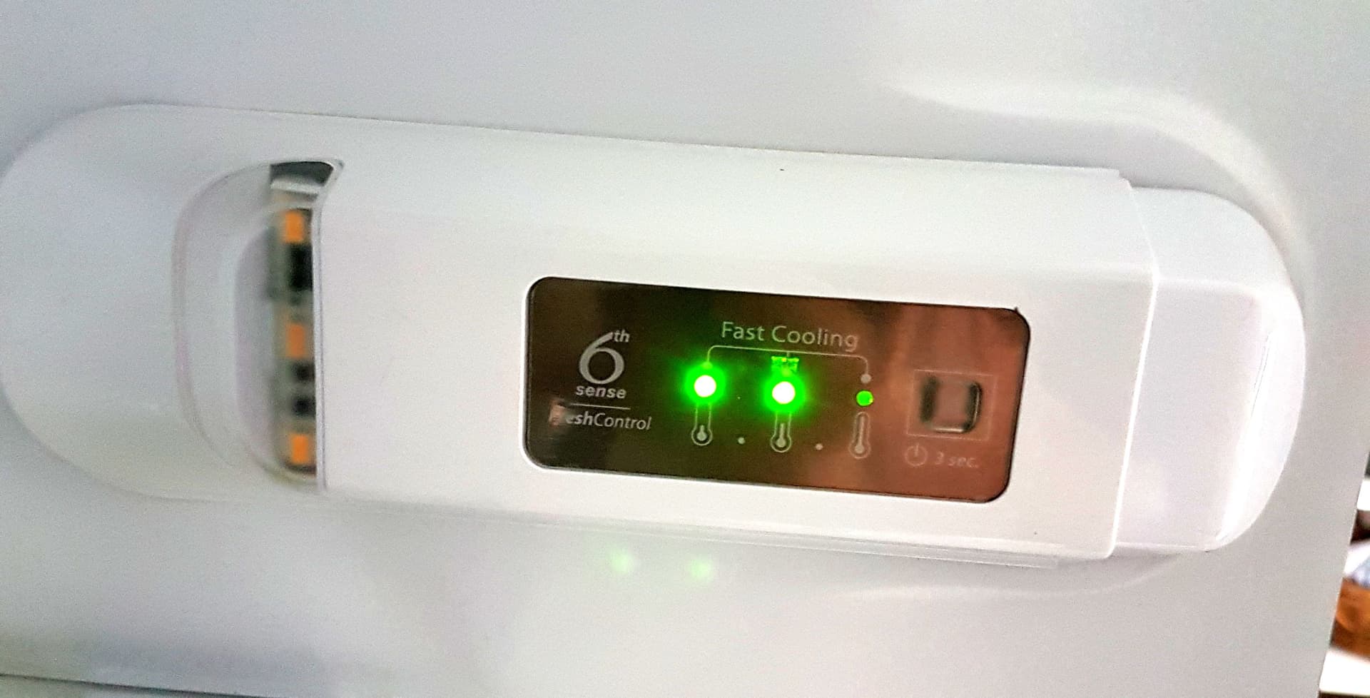 Résumé: il faut d’abord enlever le bouton gros poussoir blanc, afin d’accéder au gros clip qui retient le boîtier contre la paroi du réfrigérateur.