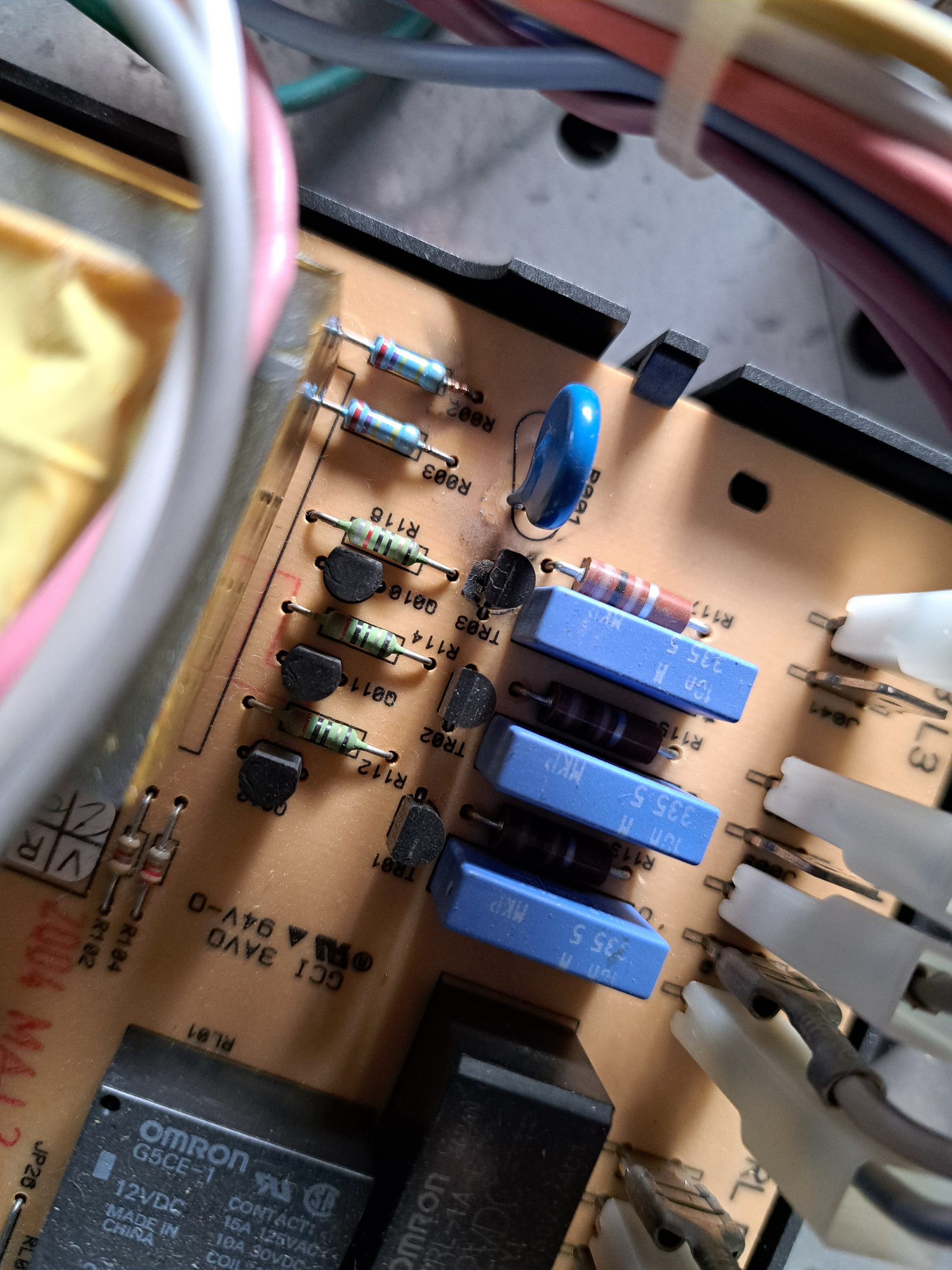 inspection visuelle de la carte de puissance : 1 condensateur semble s’être détérioré : le plastique est fendu (cf. 1ère photo, composant TR03)