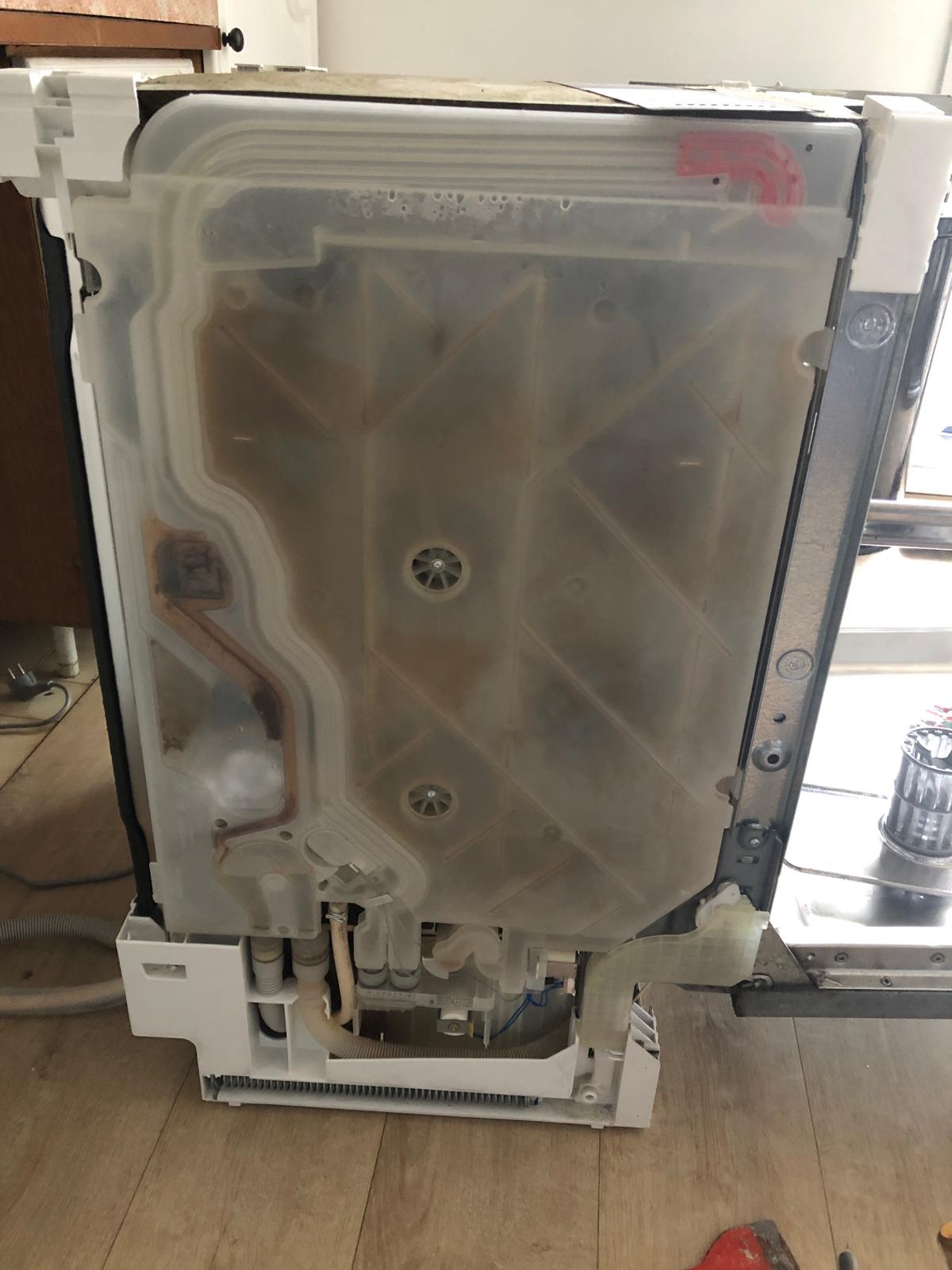 J’ai sorti la machine, démonté la parois avant ( partie basse), les parois extérieures pour vérifier s’il y avait de l’eau ailleurs : je n’ai rien trouvé. Aucun des joints des différents tuyaux n’avait de fuite.