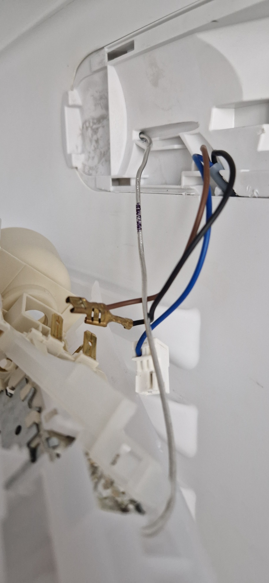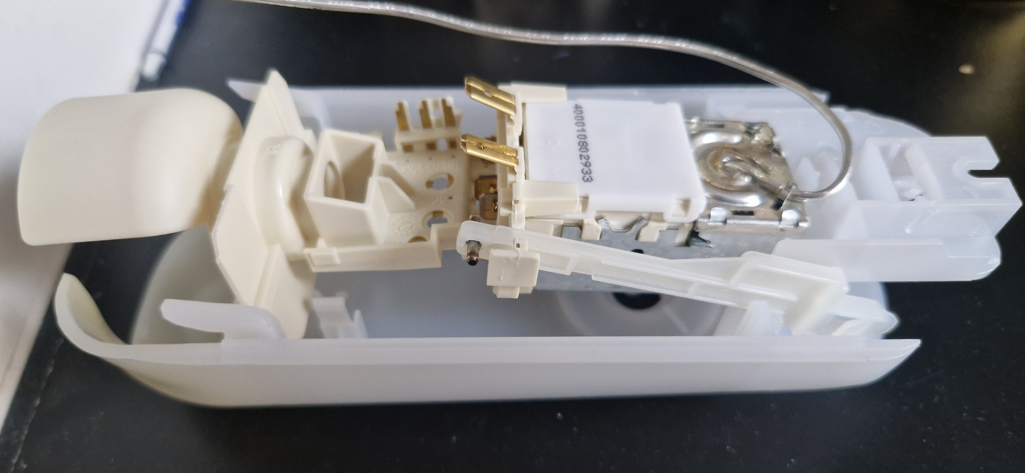 Rentrer cette tirette dans le bloc thermostat par la partie qui est visible plus fin. La partie complètement à droite viendra se loger dans le gros interrupteur plastique sur lequel la porte appuie en se fermant. Cet interrupteur + le ressort n’est pas facile à remettre dans la tirette une fois le bloc transparent refixé dans le coté du frigo, faire un essai avant.